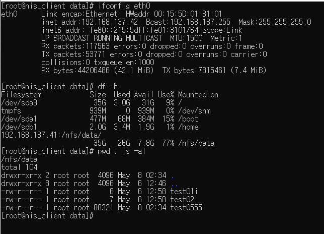 $ mount -t nfs 192.168.137.41:/nfs/data/ /nfs/data/